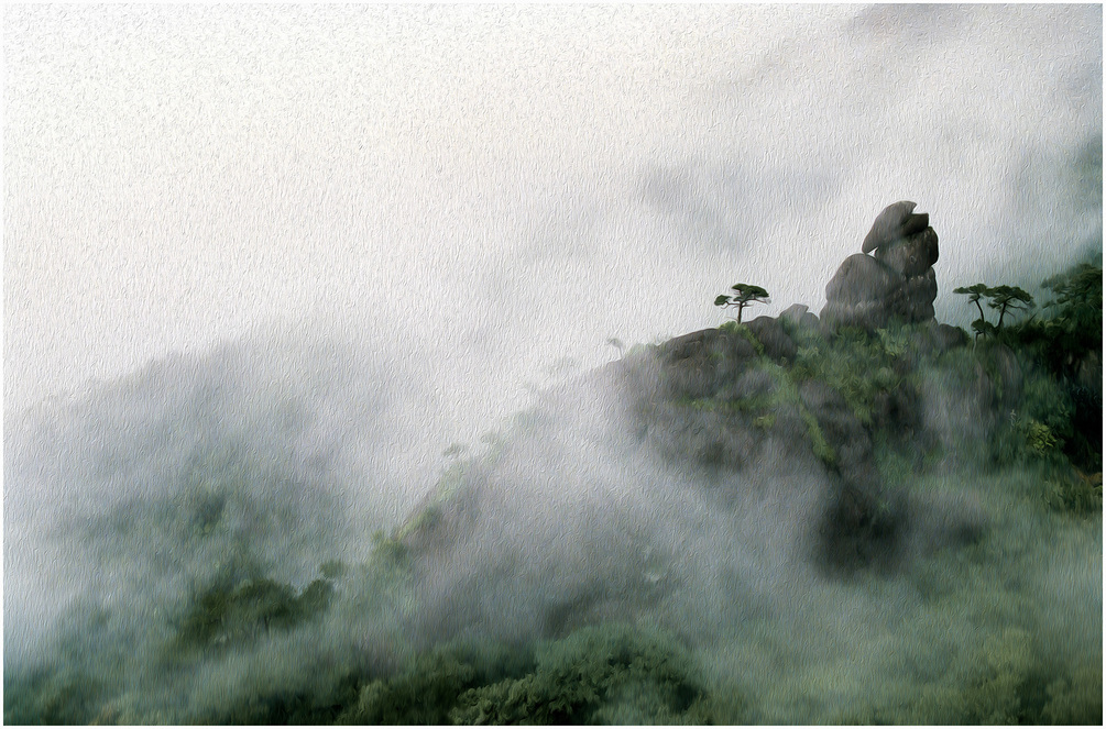 This piece of digital art (converted from a photo taken by me in 1991) is an oil painting of the Mt. Sanqingshan located in Jiangxi Province of China. This mountain is famous for Taoism. Since 2008, its national park has been listed by the UNESCO World Heritage Committee under the Natural Criterion vii.